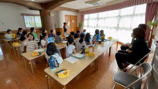 | このほど、球磨清流学園の4年生20名の皆さんが総合的な学習の時間の一環で渡保育園に来てくれました。4年生は今、『大好き!球磨村』の学習に取り組んでいて、福祉について調べたり、地域の方と触れ合ったりする活動を通して郷土を愛する心や郷土に住む人々を大切にしようとする心情を育てようと今回実施されました。保育に関することや子育て支援に関することについて子どもたちから直接質問があり、それにこたえる形で進みました。 |