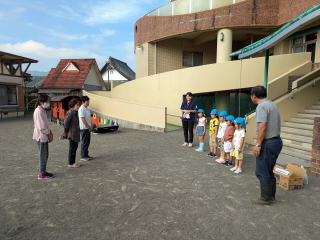 | 昨年6月23日に村長さんへ収穫した野菜を届けましたが、その後間もなく7月豪雨災害により球磨村は被災。それからおよそ1年。先日、渡保育園のわんぱく農園で収穫した野菜を再び球磨村の松谷村長さんへ届けました。この日は年長児の代表4名が球磨村役場を訪問し、農園で実ったきゅうり、かぼちゃ、ピーマン、玉ねぎ、じゃがいも、ミニトマト、オクラの7種類の野菜を届けました。松谷村長さんにはとても喜んでいただき、帰るときには子どもたちにバナナのおみやげをいただきました。ありがとうございました。 |