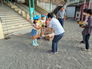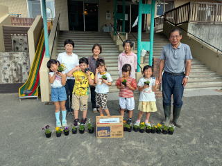 | JAくま女性部球磨村支部様より花の苗をいただきました。年長児さんたちが代表で受け取り、さっそくプランタ等に植えました。ありがとうございました。 |
