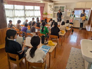 | このたび、熊本県果実農業協同組合連合会の協賛で熊本県果樹生産振興対策本部様より、『くまもと県産のおいしいみかん』を提供していただきました。2階ホールで贈呈式を行い、球磨地域振興局の方から、みかんの種類やおいしいみかんの見分け方等のお話をしていただきました。提供していただいたみかんはその日のうちにおみやげとしてそれぞれお家に持って帰りました。ありがとうございました。 |