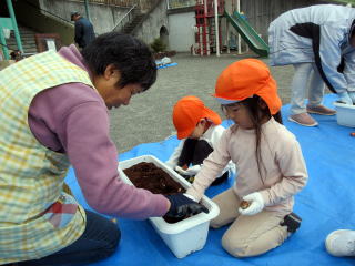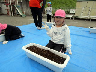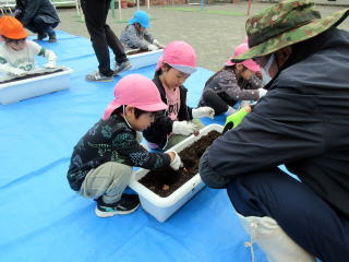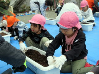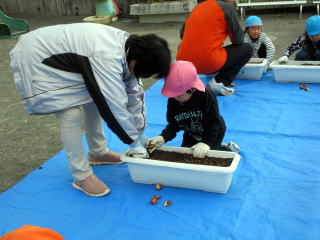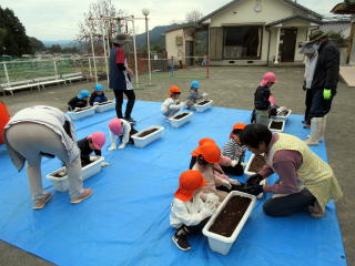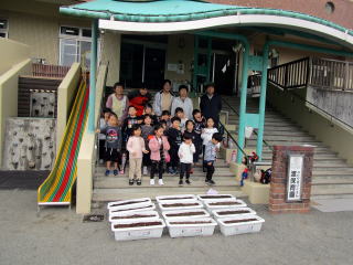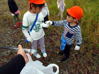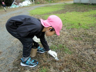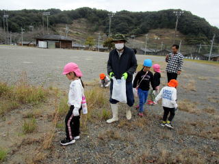 11月に入りましたが、寒さもそれほど厳しくなく、過ごしやすい毎日です。そんな中、以上児さんたちで保育園隣の運動公園内のごみ拾い活動を行いました。お菓子袋のくずや空き缶等様々なごみがありました。また、クリーン作戦終了後には、チューリップの球根を植えました。クリーン作戦と球根植えでは、球磨村ボランティア連絡協議会の会員の皆様にもお手伝いに来ていただきました。たいへんお世話になりました。