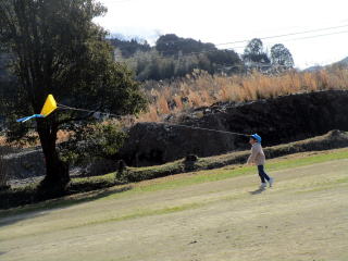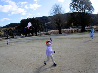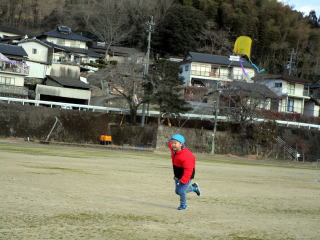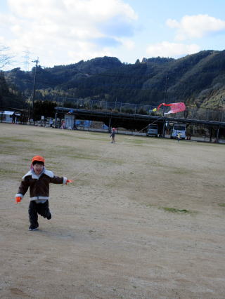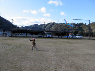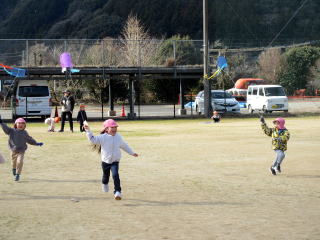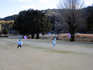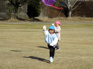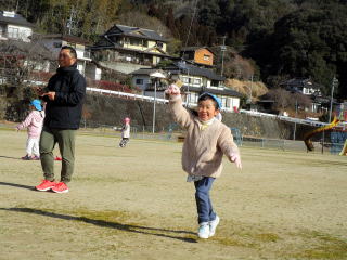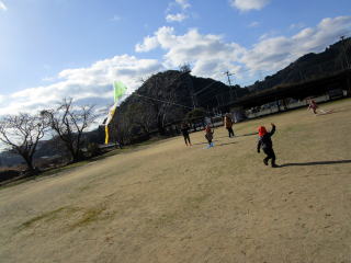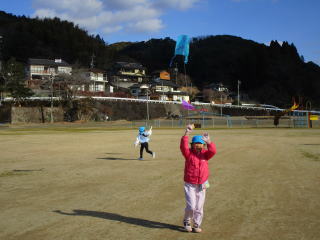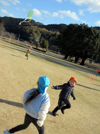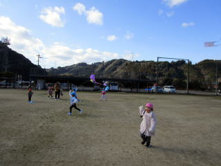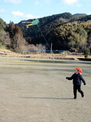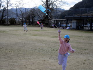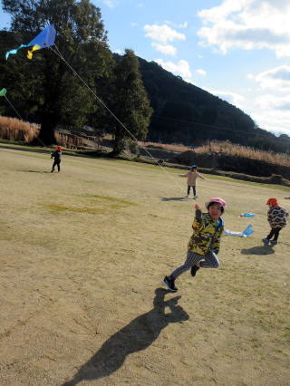 1月も後半に入ったこの日、以上児そらぐみさんたちが旧渡小学校まで歩いてグラウンドで凧揚げをおこないました。寒い中ではありましたが、晴れた青空の下で子どもたちは元気よく走り回りながら上手に凧をあげていました。